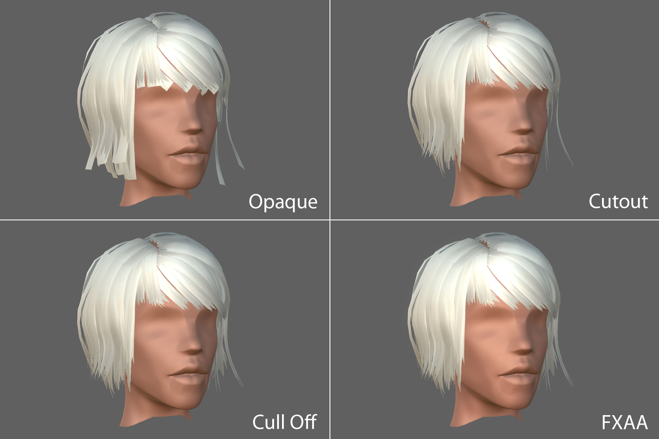 This article leads you through my experience a few weeks ago. Let’s say you have modeled and textured hair for your low-poly character and want to drop it into Unity. After importing your mesh you play with the different rendering modes of the default material and come to the conclusion that they all give you unsatisfactory results. You then settle on the Cutout rendering mode and cringe while noticing the backface culling, causing most of your hair mesh to disappear.