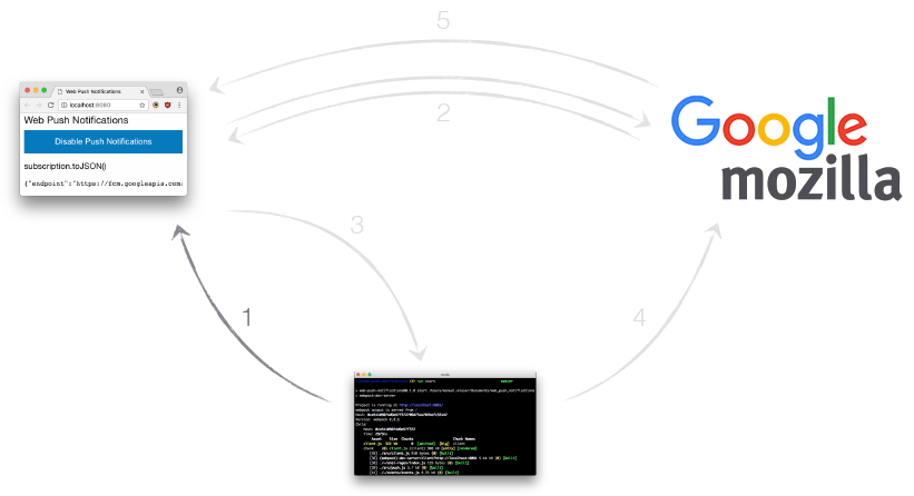 applicationServerKey. Your app installs a service worker in the user’s browser. - During the subscription flow the browser requests a subscription from the messaging server. Each browser vendor has it’s own messaging server, but your browser knows which server to call.